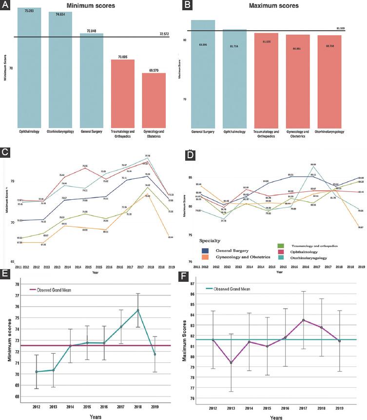 Table 1 depicts the means, standard deviation, standard error, and 95% CI for the MinSco and MaxSco scores in each specialty. Figure 1C and D shows mean comparison of surgical specialties showing the trend by year. Figure 1E and F depicts the global trend of the MinSco and MaxSco during 8 years (2012-2019).