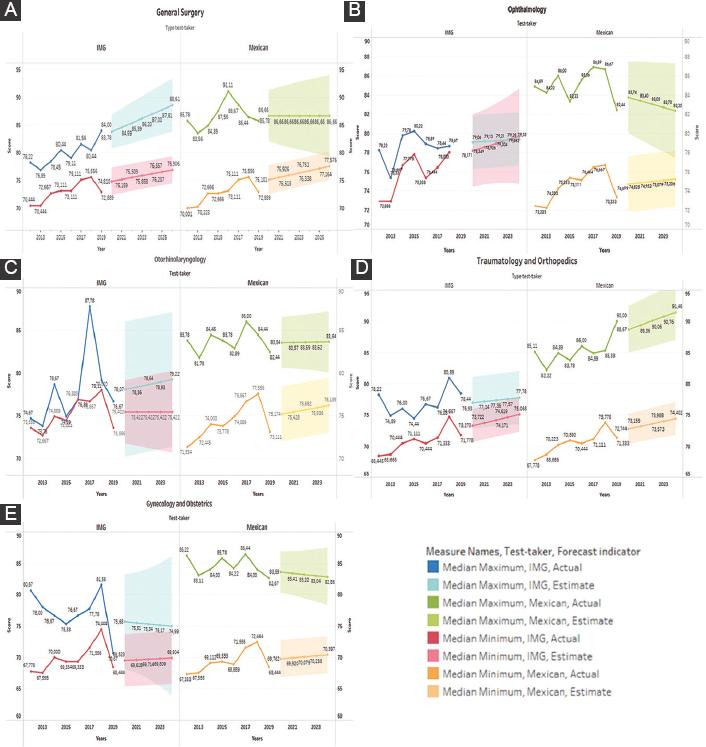 Four specialties showed a convergent pattern for Mexicans between the MinSco and MaxSco: general surgery, gynecology and obstetrics, ophthalmology, and otorhinolaryngology. Only traumatology and orthopedics showed a very mild divergent trend. In IMG, three specialties depicted a convergent trend: gynecology and obstetrics, ophthalmology, and traumatology and orthopedics; and the other two, otorhinolaryngology and surgery, showed a divergent trend. Figure 3 shows the forecasting trends between minimum and maximum scores of Mexicans and IMG.