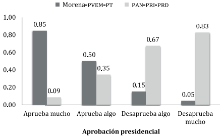 La pregunta que guía este análisis es si las elecciones fueron de carácter plebiscitario o si hay otra manera de interpretarlas. La respuesta depende del significado que atribuyamos a la aprobación presidencial. El sentido común nos dice que la aprobación presidencial es un indicador del desempeño del gobierno o del liderazgo en turno. Bajo esa perspectiva, el peso de la aprobación presidencial en las decisiones electorales reflejaría un voto que se manifiesta como una evaluación de desempeño. Sin embargo, el sentido común no siempre es del todo correcto. Podríamos suponer que la aprobación presidencial también sea una manifestación de apoyo que no necesariamente implica performance, sino que más bien va cargada de empatía y de identidades sociopolíticas. Por ejemplo, la aprobación presidencial suele tener un componente partidario muy fuerte y, en algunos casos, un componente de identidad ideológica también.1 Es posible que, entre los partidistas, la naturaleza evaluativa esté presente en el apoyo al presidente, pero se explica más por otros factores que no necesariamente son resultado de un desempeño percibido. Incluso las respuestas a preguntas de desempeño pueden ser reflejo de los sesgos partidarios y no al revés. La literatura reciente ha identificado claramente el peso de las identidades y referentes grupales en el apoyo político.2 Con un presidente particularmente dado a los discursos identitarios, se amplía la posibilidad de que la aprobación presidencial refleje esos componentes identitarios. Eso nos invita a plantear que el apoyo o rechazo al trabajo del presidente o del gobierno en turno puede ser la manifestación de simpatías políticas e identidades sociales y grupales, y no necesariamente un acto de evaluación racional calculada a lo que el gobierno ha hecho o piensa hacer.