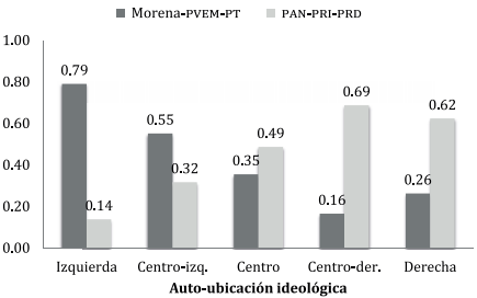 Los resultados del modelo de regresión muestran que, en términos de impacto estadístico, las variables más relevantes en el voto fueron la aprobación presidencial, haber votado por AMLO en 2018, la identificación partidista y la autoubicación ideológica de izquierda y derecha. De ellas, la estadística Wald sugiere que el mayor impacto en el voto lo tuvo la aprobación presidencial. Las variables están ordenadas en el cuadro de acuerdo con el valor de la estadística Wald, a manera de ranking de impacto. Para ver con más claridad el efecto de estas variables en la votación, hemos derivado las probabilidades de voto del análisis de regresión para mostrar las relaciones gráficamente. El Gráfico 1 muestra el grado de polarización del voto en 2021 según la aprobación presidencial. Los votantes que dijeron “aprobar mucho” el trabajo del presidente López Obrador tenían una probabilidad de 0.85 de votar por el bloque de partidos de la alianza encabezada por Morena, y apenas 0.09 de probabilidad de votar por el principal bloque opositor. Entre los que dijeron “aprobar algo” el trabajo del presidente el escenario estaba más cerrado, aunque era claramente favorable al partido gobernante, con 0.50 de probabilidades de votar por Morena y aliados, y 0.35 por la alianza Va por México. Esto significa que la aprobación blanda, a diferencia de la aprobación fuerte, no era garantía de voto por el partido gobernante. Entre quienes dijeron “desaprobar algo” al presidente, la división de votos luce marcadamente a favor de la alianza opositora, con probabilidades de voto de 0.67 y 0.15 por la oposición y el gobierno. Finalmente, entre quienes dijeron que “desaprueban mucho” el trabajo del presidente, el apoyo de la alianza opositora alcanza una probabilidad de 0.83 y el apoyo a Morena y aliados de apenas 0.05.