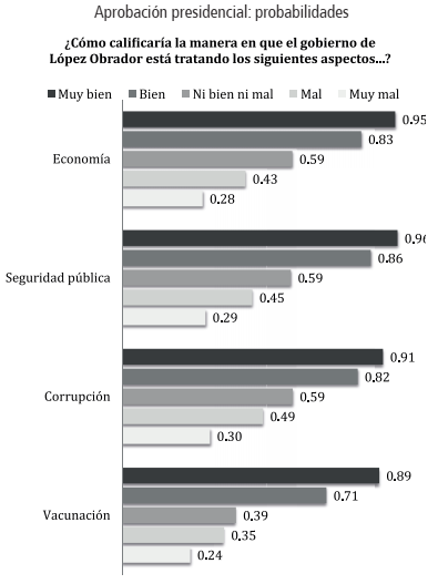 Gráfico 5 Probabilidad de aprobar la labor del presidente según la opinión sobre el manejo de gobierno en distinto rubros: economía, seguridad, corrupción y vacunación