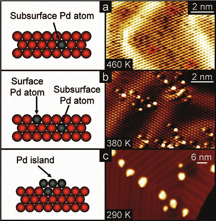 Figura 5 Dependencia entre la temperatura durante el proceso de la aleación y la incorporación de los átomos de Pd sobre el Au(111) (esquema de vista lateral y la imagen de STM correspondiente). (a) Después de la deposición de Pd a 460 K, los átomos de Pd residen en la capa subsuperficial y aparecen en la imagen de STM como depresiones trilobuladas (indicadas con triángulos rojos). (b) A una temperatura más baja (380 K), los átomos de Pd se incorporan en las capas superficiales y subsuperficiales: los átomos superficiales se visualizan como protrusiones, mientras que los subsuperficiales aparecen como depresiones trilobuladas. (c) Tras una deposición a 290 K, los átomos de Pd intercambian de lugar con los átomos de Au en sitios de dislocaciones de borde, y posteriormente sirven como centros de nucleación para el crecimiento de monocapas en forma de islas pronunciadas de Pd en la superficie de Au, constituidas por una mezcla de Pd y Au rica en Pd. Imágenes de STM obtenidas mediante el equipo Omicron LT UHV SPM. Reproducido con permiso de A. E. Baber et al. [17], ACS Nano, 2010, 4, 1637.