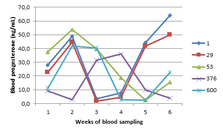 During the 35 days of the test, samples of 1 ml of blood were taken every 7 days per animal, after physical and chemical containment (Montes-Pérez et al., 2014). The blood samples were placed in test tubes with aqueous solution of 10% EDTA, centrifuged at 3000 X G (HERMLE, USA) for 3 minutes. The plasma was stored at -12 °C until the determination of progesterone levels. The blood samples were processed according to Montes-Pérez et al. (2014), using the Coat-A-Count kit, Siemens, USA (TKPG1), to estimate blood progesterone levels.