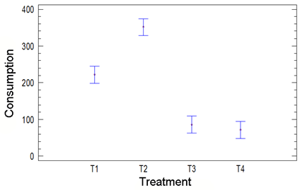 The variance analysis of dry matter consumption among the four silage mixtures showed significant differences. The 95% confidence intervals between the treatments are shown in figure 1. There is a significant difference (p <0.01) between T1 and T2 and of these with respect to the rest; except between T3 and T4 (p> 0.05). The silage treatment that showed the highest consumption by peccaries was T2.