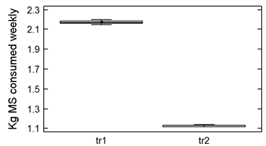 There are significant differences between the consumptions of the weekly total average treatments in dry matter between tr1 and tr2 (Fig. 2) (p <0.01).