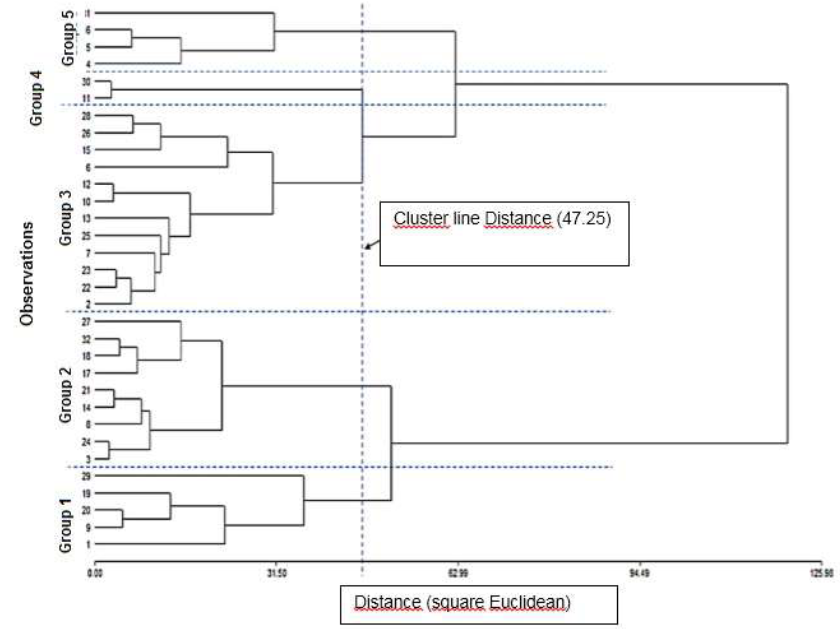 Figure 1 shows the formation of the clusters (groups), as well as the distances between them. The analysis located the producers that contained some type of similarity in clusters, synthesizing and taking advantage of the available information, and resulting in a set of information grouped according to their hierarchical level and in which 5 groups of clusters were defined.