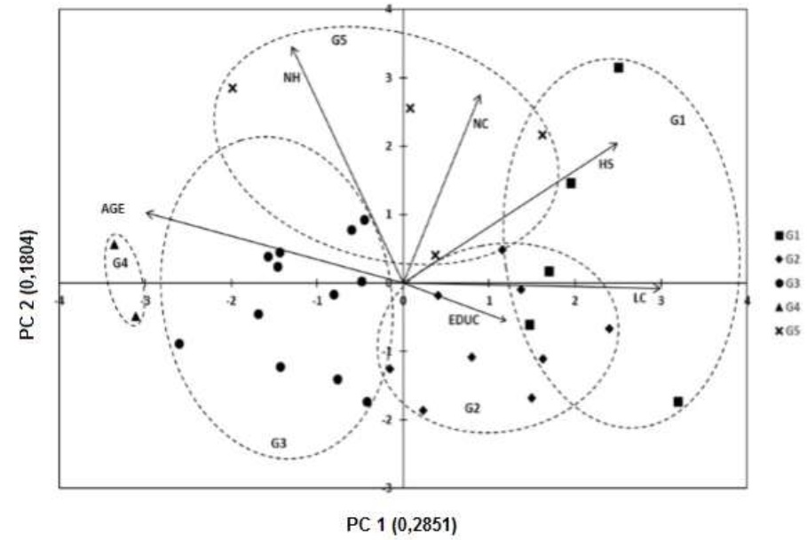 Figure 2 Set of PC 1 and PC 2 where they are integrated as factors. NH = Number of children; NC= Number of goats; HS = Hectares sown; LC = liters of goat milk-1 day-1; EDUC = Schooling; G1, G2, G3, G4 and G5 = Groups resulting from the HGA analysis