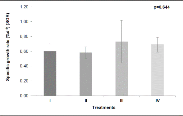 Specific growth rate (SGR). SGR (%day-1) did not show significant differences (p = 0.644) among treatments (Fig. 4). Treatment I presented 0.60 ± 0.10 %day-1, treatment II presented 0.58 ± 0.08 %day-1; while treatment III presented the highest specific growth rate per day with 0.73 ± 0 .29 (%day-1), and treatment IV presented 0.69 ± 0.10 %day-1. These results indicate that EVCO did not have an effect on SRG (%day-1).