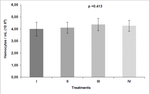 Total hemocyte count (THC). Statistical analysis of total hemocyte count showed no significant differences (p = 0.413) between treatments. The total hemocyte count per milliliter of hemolymph was higher in treatment III with an average of 4.37 x 106 ± 0.52 x 106 cells /mL, followed by treatment IV with 4.27 x 106 ± 0.46 x 106 cells /mL, treatment II with an average of 4.10 x 106 ± 0.46 x 106 cells /mL and treatment I with an average of 3.99 x 106 ± 0.57 x 106 cells /mL (Figura. 6).