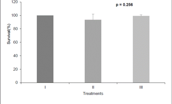 Survival and specific growth rate (SGR). No significant differences were found in survival among treatments (p = 0.256); however, survival (Fig. 1) in treatment I was 100 %, while in treatments II and III with 2.5 % and 5 % EVCO, values of 93.33 % and 98.89 % were obtained, respectively.