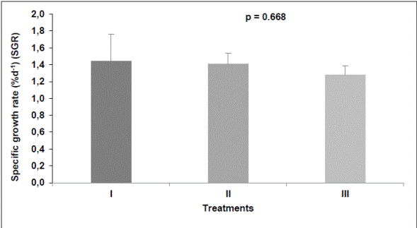 Figure 2. Specific growth rate of L. vannamei. Treatments: (I) CF control (35 % protein); (II) CF + 2.5 % EVCO; (III) CF + 5 % EVCO. Bars indicate mean value ± standard deviation and (P) ANOVA analysis of variance