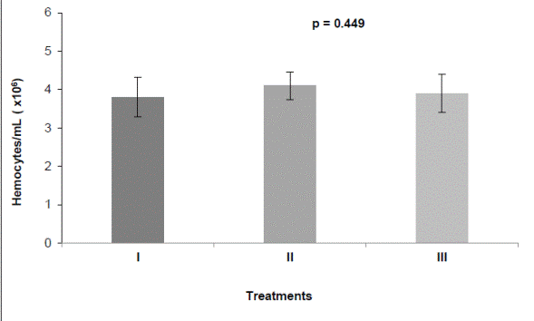 Figure 3 Total hemocyte count (hemocytes/mL) in L. vannamei. Treatments: (I) CF control (35 % protein); (II) CF + 2.5 % EVCO; (III) CF + 5 % EVCO. Bars indicate mean value ± standard deviation and (P) ANOVA analysis of variance