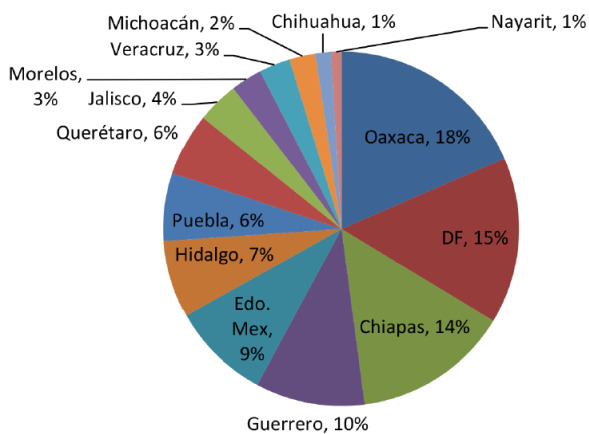 Se realizaron 341 evaluaciones (73 en 2011, 53 en 2012, 56 en 2014, 65 en 2015, 55 en 2016 y 39 en 2017). A la valoración inicial acudieron solamente 211 artesanos y por lo menos 41 acudieron a una consulta de seguimiento. En el Cuadro 1 se describe la población por edad y sexo para cada año, observándose una mayor proporción de mujeres. La edad, talla y peso promedio de la población bajo estudio fue de 43 años, 1.54 m y 64.3 kg respectivamente. En la Figura 1 se muestra la procedencia de la población bajo estudio por entidad federativa.