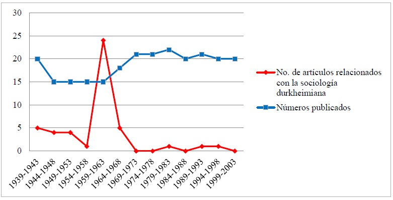 La presencia de la sociología durkheimiana en la RMS es heterogénea y, podría decirse, tendió al descenso hasta llegar a la ausencia. Lo que mostramos en la gráfica 1 es que, del total de artículos publicados desde la fundación de la RMS y hasta entrado el nuevo siglo (3,629 artículos), tan sólo 1.2 % utiliza o discute directamente el trabajo del sociólogo francés. Porcentaje llamativo si se considera que, de 1939 a 2003, fueron publicados 243 números de la revista y sólo 1 (0.4 %) concentra la mayor cantidad de referencias al autor: el número 3 de 1959. Dicho número reúne 24 títulos en torno al autor (0.6 % del total de artículos publicados hasta 2003) bajo la dirección de Lucio Mendieta y Núñez (1939-1965). En éste colaboraron 16 autores: 14 extranjeros y dos mexicanos (Óscar Uribe Villegas -editor, colaborador y principal traductor del número- y el mismo Mendieta y Núñez); posible evidencia del escaso interés en la sociología durkheimiana por parte de la élite intelectual mexicana (que en ese periodo se dedicaba a la sociología y/o se asumía como sociólogo), pese a la pregonada influencia del positivismo y el funcionalismo en el desarrollo de la sociología en México. Así, Cuvillier, Lenoir, Sicard, Davy, Birou (Francia); N. Bellah, Alpert, Dohrenwend (EEUU); Mac-Lean (Perú); Recaséns (hispano-guatemalteco); Pinto (Brasil), y Carmona (España) figuran a lado de Durkheim y Mauss, mientras las contribuciones mexicanas brillaron por su ausencia. La pretendida influencia del funcionalismo en el desarrollo de la sociología mexicana (Sefchovich, 1989, p. 16) se vuelve mítica (por lo menos de manera parcial) al considerar su escasa presencia en revistas de alto impacto nacional e internacional. Tal es el caso de la RMS .