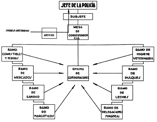 En términos orgánicos, la Inspección se subdividió en siete jefaturas de agentes especiales: de Narcóticos, de Sanidad, de Comestibles y Bebidas, de Leches, de Mercados y Plazas, de Higiene y Veterinaria, y de Agentes Foráneos -para 1935 se agregó el servicio de Pulques-26 (véase organigrama, imágen 1). A todas las jefaturas se procuró