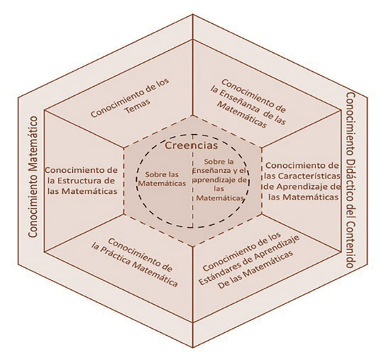 El modelo Mathematics Teachers’ Specialized Knowledge - MTSK (Carrillo et al., 2013) adopta una postura crítica ante la tendencia de comparar el conocimiento del profesor de matemáticas con el conocimiento exigido a otros profesionales, como matemáticos o profesores de asignaturas distintas de las matemáticas (Scheiner et al., 2017) y considera el carácter especializado del conocimiento del profesor de matemáticas que abarca seis subdominios del conocimiento (figura 1). Tres de ellos conforman el Conocimiento Didáctico del Contenido: el conocimiento de la enseñanza de las matemáticas, el conocimiento de las características del aprendizaje de las matemáticas y el conocimiento de los estándares de aprendizaje de las matemáticas. Otros tres se consideran en el Conocimiento Matemático: el conocimiento de los temas, el conocimiento de la estructura de las matemáticas y el conocimiento de la práctica matemática. El MTSK incluye también el dominio de las creencias/ concepciones del profesor sobre la matemática y su enseñanza y aprendizaje. Su ubicación en el centro del modelo expresa la estrecha relación con los subdominios anteriores.