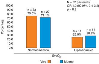Los niveles de SvcO2 reflejan alteraciones en la extracción de oxígeno (ERO2) en pacientes con choque séptico. La ERO2 también resulta útil para determinar el estado hemodinámico de estos pacientes: un incremento (> 30%) sugiere hipodinamia o metabolismo celular elevado; por otro lado, la disminución (< 20%) se asocia con hiperdinamia o metabolismo celular bajo. En ambas situaciones, la perfusión tisular o la microcirculación pueden ser deficientes, siendo la falta de coherencia hemodinámica (macrocirculación ≠ microcirculación) una de las características en estos enfermos.20 La clasificación de normodinámico versus hiperdinámico fue realizada con la SvcO2 ≥ 80%, pues esta condición, que va más allá de un estado clínico, también la observamos en nuestro análisis bivariado, donde se documentó ERO2 de 32.84 versus 17.43 para el grupo de normodinamia e hiperdinamia, respectivamente, con significancia estadística (< 0.001). Estudios han correlacionado niveles superiores al 80% de SvcO2 con mortalidad en pacientes que presentan choque séptico. La SvcO2 fue de 85% (78 a 89) en los no sobrevivientes, en comparación con 79% (72 a 87) en los sobrevivientes (p = 0.009).21 Los niveles de SvcO2 (altos o bajos) pueden reflejar la gravedad del estado de choque, representando el porcentaje de oxígeno que la célula no utiliza (por alteraciones del metabolismo celular) de la sangre arterial. Esto podría deberse a mala distribución de la perfusión tisular por trastornos microcirculatorios que impiden la llegada del oxígeno a los tejidos. Una cohorte retrospectiva que incluyó 619 pacientes evaluó la mortalidad en los pacientes con choque séptico según los niveles de SvcO2 alcanzados tras la reanimación; la mortalidad fue de 40% (IC 95% 29-53%), 21% (IC 95% 17-25%) y 34% (IC 95% 25-44%), respectivamente, según los grupos: < 70%, 71-89% y ≥ 90%.22 Nuestro estudio incluyó 82 pacientes (60 normodinámicos y 22 hiperdinámicos), sin encontrar diferencias en la mortalidad: 27 (45%) versus 11 (50%), respectivamente, con p = 0.8.