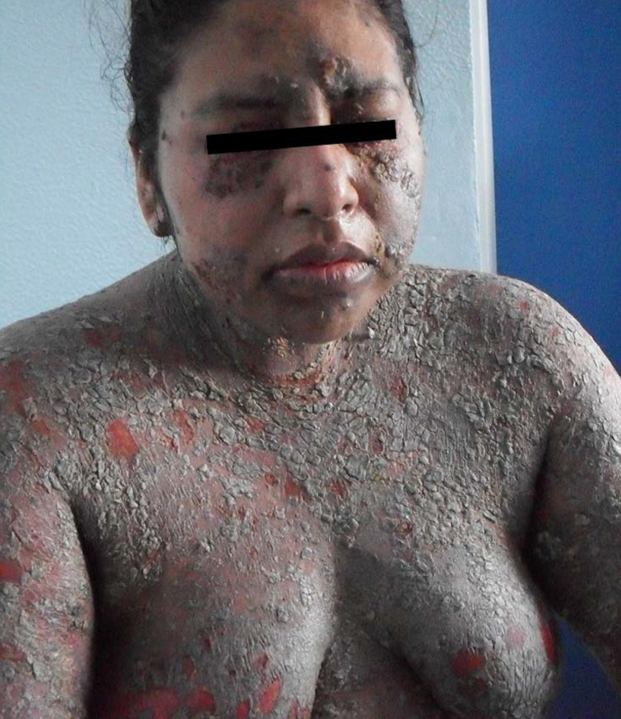 Figura 1. Pénfigo vulgar mucocutáneo severo. Dermatosis generalizada que afecta todos los segmentos corporales, principalmente tronco y extremidades, caracterizada por ampollas flácidas y friables, así como áreas de piel denudada. Nótese la presencia de lesiones en el área de labio-bermellón
