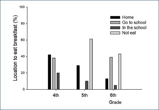 Table 1 shows that parents who have children in 4th prefer to buy their children anything to eat (55%) that to prepare it (15%). They mentioned that it was due to lack of time; shopping habits and that most prefer to eat lunch later. For the 5th, there was no significant difference (p ≥ 0.05) between buying something at the tiendita and giving money to buy it at school, which were the most frequent decisions (37% and 31%, respectively). This behavior is reduced in those who have children in 6th; however, children in this grade are given money to buy at school (44%). However, when evaluating between school grades it could be observed that buying food at the tiendita or elsewhere before arriving at school was more frequent for most 4th and 5th grade school children, while the least frequent and without significant difference was for those children who do not usually eat lunch before going to school (Table 1). Therefore, we also wanted to evaluate whether school children ate at home before going to school, and we observed that the food most frequently consumed by 4th is eggs (48%), natural juices (32%) and legumes and tubercules (26%), fruit water (26%), and soft drinks (27%). The most common drinks mentioned above made no significant difference to children in this scholar grade (Table 2). Unfortunately, it is very rare to consume fruit (2%) and milk (5%). Children of 5th and 6th also consume eggs more frequently (39% and 51%, respectively) but 5th accompany them with coffee (41%), while 6th with processed juice (40%). It should be noted that there was no significant difference in dairy consumption between the school grades and a low frequency of consumption. Likewise, there is no natural water and meal consumption by all children before going to school. However, when assessing the frequency of locations where children ate breakfast before arriving at school, the children of 4th preferred to eat breakfast at home (42%), followed by school (38%) and go to school (20%) with a significant difference between them. Nevertheless, 61% of 5th prefer not to eat breakfast and about 30% prefer to eat breakfast at home (29%), while 6th eat breakfast go to school. There was a significant difference at home and while going to school, as the children (6th) try not to do it at home and prefer it while going to school (Fig. 1). Thus, foods and beverages preferred by elementary school children (Fig. 2) are fried foods, hamburgers, hot dogs, pizza, cookies, candies, and soft drinks (Table 3). Therefore, the physical activity of the children is noticeable, since the children of 4th prefer to play brings it (41%) and different types of sports (35%); while there was no significant difference with the children of 5th who prefer to be seated (26%) in any part of the school (stairs, corridors, patio, and among others), to play some sport (27%) or to talk and walk (28%). Thus, children's PA decrease as the school grade increase, they prefer to be sit, talk and walk, and the boys prefer play any sport (Table 4). As a result, there is a significant difference in the level of PA, 6th was lower than 4th (Fig. 3). Three grades of elementary school were analyzed to determine the NS of the students (Table 5). According to the results obtained from the anthropometric analyses, a high prevalence of Ob was observed among elementary school children in the three grades evaluated. In 5th, normal and overweight were not significance difference. It should be noted that there are several factors compared to the 4th, may be that absence of PA (Fig. 3) (Table 4) and inadequate EH (Fig. 2) (Table 2) that begin to opt within the school.