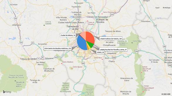 Otra forma de seguir refinando el uso de esta herramienta de geolocalización es la de buscar institucionalmente la procedencia de las reseñas, es decir, a partir de los autores que firman con una institución sus reseñas. Si nos centramos en el caso de las reseñas realizadas en la ciudad de México se puede observar el peso tanto del Centro de Estudios históricos de El Colegio de México, como de la UNAM, a través de la Facultad de Filosofía y Letras y el Instituto de Investigaciones Históricas. Gráfico 4.