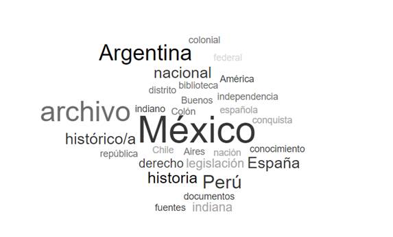 Esta representación corrobora la lectura de los títulos de los artículos y la identificación de sus palabras clave, con expresiones que remiten tanto a la historia colonial de América, con un peso acusado de México, como a las temáticas bibliográficas (artículos sobre bibliotecas y otros centros documentales).