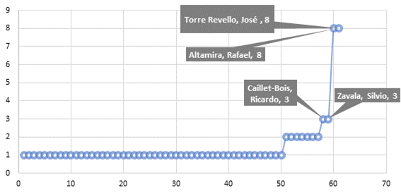 Además, nos permite observar que Zavala está en este grupo, pero no de una manera dominante, al publicar sólo tres artículos. En aquel período era frecuente que los directores publicaran de manera constante porque de algún modo representaban la voz cantante de la publicación. Sabemos que Zavala también publicó artículos en otras revistas durante esa época. En el caso de RHA, su presencia es mayor en las reseñas. Esto nos llevó a pensar en que el mexicano no planteaba su autoridad en la publicación en términos de centralidad en la autoría de artículos, que son las piezas de mayor extensión. Él estaba más enfocado en su función como editor y en el servicio que prestaba, por ejemplo, configurando, con sus reseñas, una biblioteca para el historiador. También nos lleva a reflexionar sobre el protagonismo de Rafael Altamira, su maestro en España, a quien después el exilio llevaría de nuevo a México, gracias a sus redes intelectuales. El caso de Torre Revello es distinto del de Altamira, porque su repetida aparición no se debe al prestigio académico, sino a su productividad.