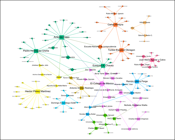 En el Gráfico 10, son los mismos datos, pero se omitieron los de las instituciones, se detectaron comunidades por medio del cálculo de modularidad y el tamaño de los nodos en función del grado; es importante hacer notar la importancia de las instituciones en esta red, ya que son las que interconectan a la mayoría de los agrupamientos, El Colegio de México, la UNAM, y la Escuela Nacional de Jurisprudencia son los nodos que permiten una mayor cohesión de la red.