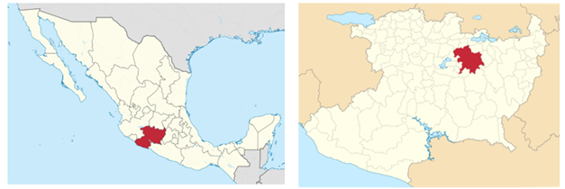 Figura 1 (a) Localización del estado de Michoacán dentro de México; (b) Localización del municipio de Morelia, incluyendo Santiago Undameo, dentro del estado de Michoacán.
