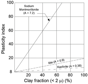 El índice de actividad de la arcilla (A) se obtuvo del análisis del hidrómetro, (ASTM D 422-63, 2016) usando la expresión (1). La figura 4 presenta la variación de A para diferentes minerales arcillosos.