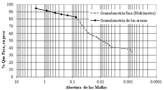 En la Figura 5 se presentan los resultados obtenidos de la granulometría gruesa del suelo arcilloso, realizada tamizando el material con mallas ASTM; y la granulometría fina, que se obtuvo a partir de la prueba de sedimentación con el hidrómetro, en escala semilogarítmica. A partir de este último ensayo se obtuvo la A de la arcilla.