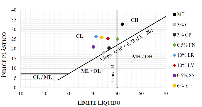 Para clasificar el suelo arcilloso (% que pasa la malla ASTM nº 200) con los diferentes estabilizadores, se realizó la prueba de los límites de Atterberg. Los resultados obtenidos se presentan en la carta de plasticidad de la Figura 6, donde la posición del suelo inalterado y de las mezclas estabilizadas reflejan su clasificación según el sistema SUCS. El suelo natural de Santiago Undameo se clasifica como una CH, coincidiendo con los resultados de la A presentada por el material. Todas las muestras de suelos adicionados quedaron localizadas en la zona CL, mostrando la evidencia del cambio de propiedades que aportan los estabilizantes; sin embargo, la mezcla que contenía FN se encontró muy cerca del límite entre las arcillas de alta y baja plasticidad. Por otro lado, la combinación que corresponde al suelo natural con un 0.5% de SS adicionado, se clasificó como una CL (ver Figura 6), presentando la mayor disminución del LL de 52.2% de la muestra testigo a 40.2% (ver Tabla 5).