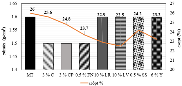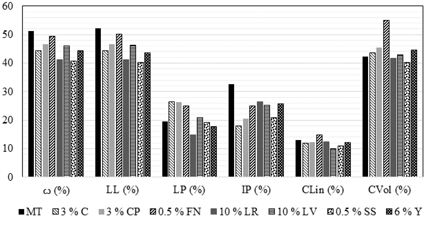 La Figura 7 muestra el conjunto de las propiedades índice de cada una de las mezclas estabilizadas y el suelo testigo de Santiago Undameo. En dicha figura se puede observar que los estabilizantes reducen el contenido óptimo de agua (ω), el LL y el IP; por otro lado, también provocan un comportamiento irregular del LP y las CLin y CVol, lo que podría corresponder a las características particulares de cada adición. Para estas tres propiedades índice (LP, CL, e IP), los valores obtenidos fueron tanto superiores como inferiores al suelo testigo.
