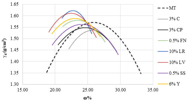 La estabilización de suelos con yeso no es muy común en la práctica y la información sobre su comportamiento es muy limitada, sin embargo, con los resultados mostrados se ofrece una certeza en su uso, pero es sabido que el yeso es soluble en agua, por lo cual requiere de cuidadosas medidas de protección. Por debajo de las mezclas con Y se encuentran con un comportamiento muy similar las mezclas con C, LR y CP, que son materiales ampliamente utilizados en la estabilización de suelos y se esperaba una mejora en el material, ya que por ejemplo en el caso de mezclas con C, al producirse la reacción de cal y agua el suelo disminuye su permeabilidad y aumenta la capacidad de carga en pocas horas formando finalmente una capa estructural fuerte y flexible (Reginaldo et al., 2018).