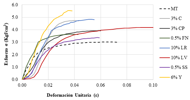 Prácticamente todas las mezclas mejoraron su comportamiento en cuanto a esfuerzo a compresión y deformaciones. Es evidente que la mezcla con 6% Y como estabilizante mejora al material rigidizándolo y aumentando su esfuerzo a compresión, esto se observa al presentar una mayor pendiente en la curva descrita por este material.