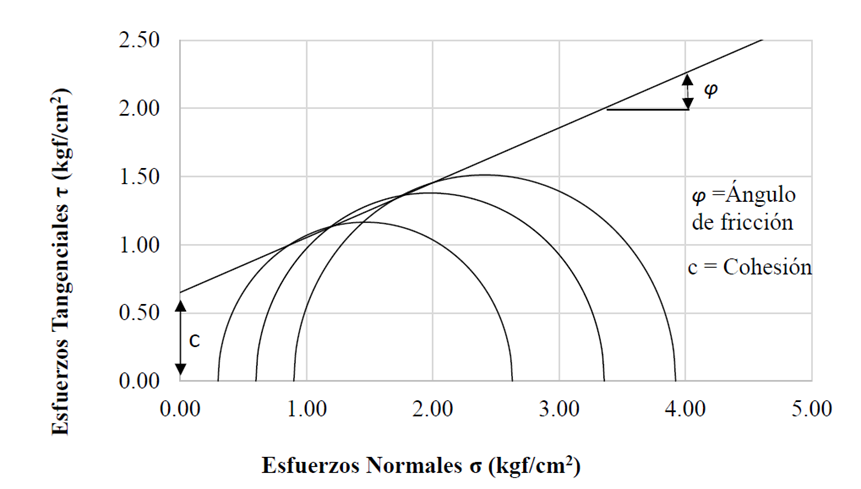 En la Figura 12 se muestra un ejemplo de envolvente de falla, utilizando al menos 3 círculos de Mohr para conocer la tendencia de la línea envolvente, y con ella, calcular la cohesión (c) y el ángulo de fricción interna (φ).