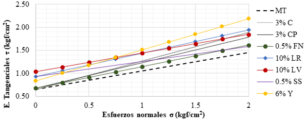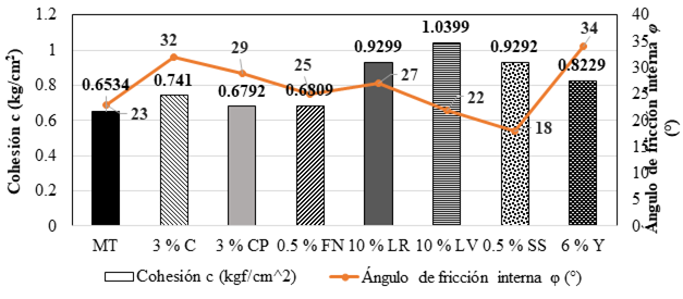 Con las envolventes de falla, se observó un cambio en la cohesión c y en el ángulo de fricción φ, dando como resultado un incremento en la resistencia mecánica de algunas mezclas. Los estabilizadores que propiciaron mayor fricción entre las partículas del suelo (mayor φ) corresponden al Y, C, CP, LR y FN. Por el contrario, LV no aporta incremento de las propiedades mecánicas, resultando en un ángulo de fricción (φ) muy similar al del suelo natural; adicionalmente, SS tampoco tuvo mucho éxito en este cometido.