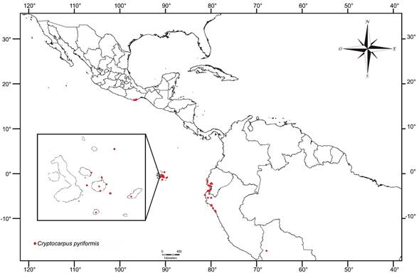 Ejemplares examinados: BOLIVIA. Departamento La Paz, Yungas, 6000 ft, V.1885, H. H. Rusby 2497 (US). ECUADOR. Provincia Galápagos, Archipiélago de Colón, Islas Galápagos, Seymour Island, round bay where seaplane ramp is located, 22.I.1964, F. R. Fosberg 44680 (US); Indefatigable Island, Academy Bay, 24.I.1964, F. R. Fosberg 44705 (US); Duncan Island, 7.VI.1932, J. T. Howell 9838 (US); Bartholomew Island (off James Island), 13.III.1950, R. Lévêque 85 (US); Santa Cruz Island, Academy Bay, 24.XII.1961, R. Lévêque 175 (US); Darwin Bay, Tower Island, 25.VI.1942, W. Schmidt 142 (US); Barrington Island, 20.X.1905-19, A. N. Stewart 1462 (US); along road from Puerto Bacqueriso (Wreck Bay) to El Progreso, Isla San Cristobal (Chatham Island), 8.II.1967, I. L. Wiggins y D. M. Porter 361 (US); along strand and around lagoon inland, E end of Post Office Bay, Isla Floreana (Charles Island), 14.II.1967, I. L. Wiggins y D. M. Porter 518 (US); Isla Santa Cruz, south Las Plazas, islets at eastern end of Isla Santa Cruz, 14.II.1964, I. L. Wiggins 18726 (US). Provincia Guayas, Guayaquil, edge of mangrove thicket, 15.VII.1939, E. Asplund 7684 (US); mangrove thicket W of the town, 18.X.1955, E. Asplund 18190 (US); Guayaquil, 9.X.1838, G. W. Barclay 2463 (US); North of Allangue on road from Santa Elena to Manglaralto, 20.V.1981, C. Dodson 11000 (US); oil camp between Guayaquil and Salinas, 21-24.VI.1923, A. S. Hitchcock 19995 (US); between Guayaquil and Salinas, near sea level, 10-14.XII.1934, Y. Mexia 6751 (US); vicinity of Guayaquil, 30-02.VIII-IX.1913, J. N. Rose 22460 (US); Guayaquil, 27.X.1924, F. L. Stevens 27 (US); 8 km W of Guayaquil 29.VIII.1938, H. E. Stork 8952a (US); roadside, El Morro, 21.VII.1962, C. D. Játiva 114 (US). Provincia El Oro, Santa Rosa, edge of salt water marsh, 21.III.1955, E. Asplund 15863 (US); between Machala and Puerto Bolivar, 26.VIII.1923, A. S. Hitchcock 21112 (US); at Puerto Bolivar, near mangrove swamps, 15.VI.1943, E. L. Little 6597 (US); Vicinity of Durán, 5-8.XI.1918, J. N. Rose 23608 (US). Provincia Manabi, entre Puerto de Cayo y Machalilla, 50 m, monte espinoso premontano, 06.VI.1989, C. Cerón et al. 6759 (MEXU). MÉXICO. Oaxaca, Distrito Pochutla, municipio Santa María Huatulco, el canal que desemboca en la dársena de Chahué, 1 km al N de la Dársena, 40 m, vegetación secundaria, orilla de arroyo, 27.V.2003, M. Elorsa 6678 (MEXU); sin localidad, 10 m, vegetación secundaria, 23.XII.2003, M. Elorsa 7745 (IEB, MEXU); proyecto Marítimo de Puerto Chaué, Bahías de Huatulco, dunas costeras, 17.IX.1991, M. Illescas y P. Huerta 9 (MEXU); playa Cacaluta, selva baja caducifolia, 17.VII.2007, V. Juárez-Jaimes y M. Ortíz 831 (MEXU); playa El Maguey, selva baja caducifolia, 31.VII.2007, V. Juárez-Jaimes 842 (MEXU); entrada a la laguna El Zanate, 25 m, selva mediana subcaducifolia, A. Sánchez et al. 697 (MEXU); entrada a la laguna del Zanate, 25 m, selva mediana subcaducifolia, 31.III.2005, A. Sánchez-Martínez et al. 697 (IEB, MEXU). Distrito Tehuantepec, municipio Santiago Astata, Barra de la Cruz, 2 km SE, camino hacia el campamento tortuguero, 5 m, selva baja caducifolia, alterada, orilla de camino, 05.IV.1999, M. Elorsa 1977 (MEXU); Barra de la Cruz, 6 km SE por la Agüita, 10 m, selva baja caducifolia, secundaria, 08.II.2000, M. Elorsa 2702 (IEB, MEXU); 50 m al S de la laguna El Cerrito, 120 m, selva baja caducifolia, 23.III.2000, M. Elorsa 2826 (MEXU); La Aguita, 5 km al E de Barra de la Cruz, 30 m, vegetación secundaria de selva baja caducifolia, 18.IV.2000, M. Elorsa 2977 (MEXU); laguna El cerrito, 3 km al SE de Barra de la Cruz, 40 m, selva baja caducifolia, 13.II.2001, M. Elorsa 4256 (MEXU); el Zapotal, 2 km al SE de Barra de la Cruz, selva baja caducifolia, 05.III.2001, M. Elorsa 4344 (IEB); campamento tortuguero, 3 km al sureste de Barra de la Cruz sobre la playa, duna costera, 16.VIII.2001, M. Elorsa 5075 (MEXU); 3 km al SE de Barra de la Cruz, sobre la playa, 25 m, matorral espinoso, 07.II.2002, M. Elorsa 5694 (MEXU); 50 m al S de la laguna El cerrito, 15 m, vegetación secundaria, selva espinosa, 27.II.2002, M. Elorsa 5813 (MEXU). PERÚ, departamento Lambayeque, provincia Chiclayo, 17.X.1940, E. Asplund 13914 (US); Yencala León a 30 km, norte de Chiclayo, 7.VII.1950, R. A. Ferreyra 7616 (US); around airport, 3.I.1945, F. R. Fosberg 22442 (US); 1-2 km inland (n. e.) from Pimentel, 21.VI.1947, F. R. Fosberg 27979 (US). Departamento La Libertad, provincial Gran Chimú, Moche valley near Trujillo, 500 km N of Lima, coastal desert and cerros of coast 100 km north and south of Lima, 7.VII.1941, V. Grant 7515 (US); provincia Pacasmayo, 26.VI.1914, J. N. Rose 18519 (US); 10 km north of Trujillo on Panamericana, 11.V.1964, R. M. Straw 2405 (US). Departamento Piura, provincia Morropon, 3 km west of Serran, 12 km east of Malacasi, on the road to Canchaque from the coast, 12.IX.1964, P. C. Hutchison 6550 (US); provincia Talara, 12 miles east of Cape Pariñas, 24.IV.1927, O. Haught 159 (US); provincia no definida, 15.XI.1910, C. H. T. Townsend 813 (US). Departamento Tumbes, provincia Contralmirante Villar, cerca de Bocapán, monte ralo xerofítico, 24.IV.1955, R. A. Ferreyra 10556 (US); Pampas de Hospital, in Quebrada Angostura near village of Angostura, Bosque Nacional de Tumbes, cerca de El Caucho o entre El Caucho y Pampas de Hospital, 29.XII.1967, D. R. Simpson s.n. (US); coastal plain between Zorritos and Tumbes, 8.III.1927, A. Weberbauer 7747 (US).