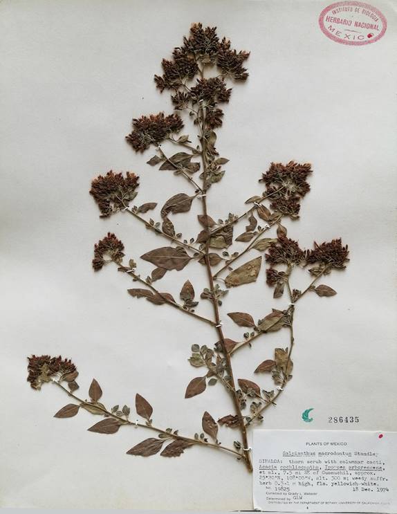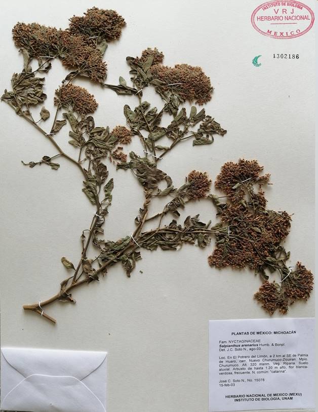 Salpianthus standleyi Steyerm., Publ. Field Mus. Nat. Hist., Bot. Ser. 22: 139. 1940. TIPO: MÉXICO. Guerrero, municipio Arcelia, Temisco, Barranca del Consuelo, above stream in open, Sierra Madre del Sur, north of Rio Balsas, Distrito Aldama, 11.XI.1937, Y. Mexia 8783 (holotipo: F-955142!; isotipos: B-100248348!, CAS-0004373!, G-00037457!; K-000572687!, MO-468945!, NY00342139!, S-0713106!, U-0005260!, UC-645120!, US-00103082).