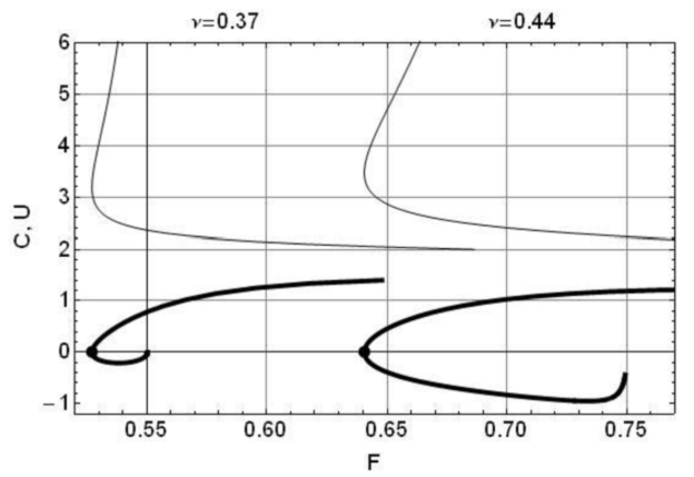 F Є (0.64, 0.75) for v = 0.44 .