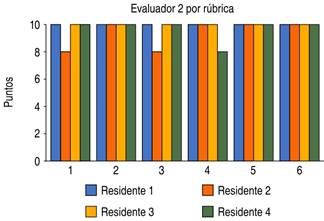 La aplicación de esta rúbrica nos permitió corroborar, a partir de la observación de dos profesores, la evolución en la adquisición de competencias, observar cómo el residente de mayor jerarquía realiza las actividades con mayor competencia que los residentes de años inferiores.10