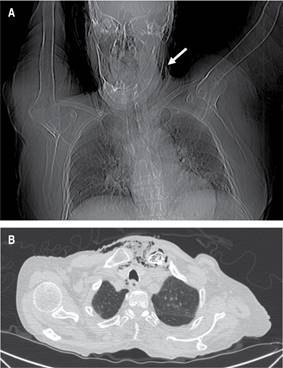 Figura 1: A) Topograma que muestra presencia de aire en región cervical izquierda (flecha blanca). B) Tomografía computarizada en la que se observa ventana pulmonar con evidencia de aire retrotraqueal y enfisema subcutáneo.