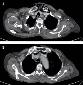 Figura 2: A) Neumomediastino con destrucción ósea y aire en borde esternal de clavícula izquierda. B) Neumomediastino con destrucción ósea y aire en manubrio esternal.
