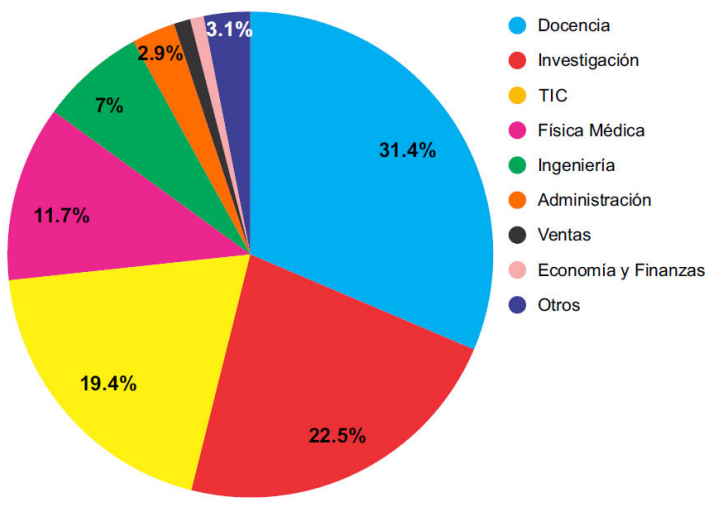 En la gráfica de la Fig. 5 se presenta la distribución del área laboral reportada por los encuestados, de la cual es posible establecer que los egresados de Física, Ingeniería Física y afines, se colocan en diversas áreas. El área con mayor presencia es en la academia, ya sea como docentes (31.4%) o investigadores (22.5%), así como en trabajos en el área de Tecnologías de la Información y Comunicación (TIC) (19.4%), Física Médica (11.7%) e Ingeniería (7.0%), Administración (2.9%), Ventas (1.1%) y Economía y Finanzas (0.9%). En el área denominada Otro se incluyen áreas de menor presencia como, Consultoría (0.7%), Divulgación (0.7%), Instrumentación (0.5%), Educación (0.5%), Ciencias Forenses (0.5%) y puestos basados en oficios como herrero o panadero con un 0.2%.