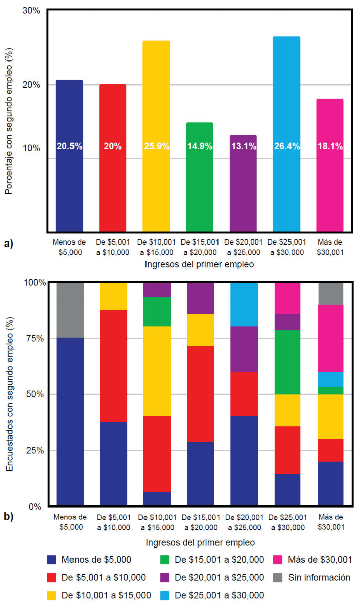 Resulta interesante identificar que conforme el sueldo del primer empleo es mayor, se tiene también un mayor ingreso por el segundo. Por ejemplo, un 20.5% de los encuestados con sueldo menor a $5,000 mensuales refirió tener una segunda ocupación y el 75% de ellos obtiene menos de $5,000 por su segundo trabajo. Adicionalmente, el 18.1% de los encuestados que perciben más de $30,000, tienen una segunda ocupación, del cual el 36.6% recibe mensualmente una cantidad superior a $25,000.