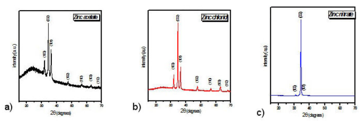 Figure 1 shows the XRD diffraction spectra of ZnO thin films obtained using zinc acetates (Fig. 1a), zinc chloride (Fig. 1b) and nitrates of zinc (Fig. 1c) as precursors.