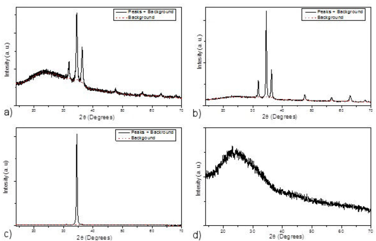 In this sense, the films obtained can be characterized by a parameter (the amount of amorphous material) that can inform us about their crystalline quality, thus indicating the amorphous and crystalline fractions that make up the samples thus obtained. Experimentally, the amorphous state of a given material results in the recording of a diffraction spectrum with a very broad peak at all angles 2θ scanned. This is clearly seen in the spectrum of Fig. 2d), relating to the glass we used as a deposition support for our films.