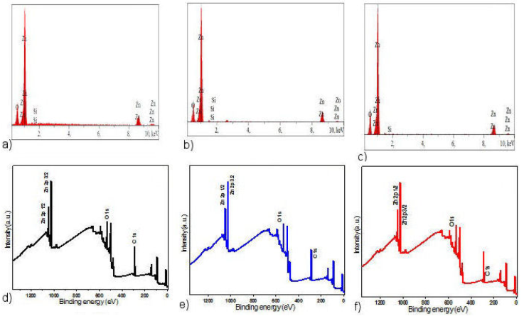 Figure 3 a)-c) Energy dispersive X-ray (EDX) spectra, d)-f) XPS full survey scan of the obtained zinc acetate, zinc chloride and zinc nitrate, respectively.