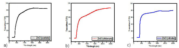 The optical transmittances have been recorded between 200 and 2500 nm wavelength using a JASCO 570 type UV-vis-NIR double-beam spectrophotometer. Figures 4a)-c) show the optical spectra for ZnO thin films obtained by using different precursors such as zinc acetate (Fig. 4a)), zinc chloride (Fig. 4b)) and zinc nitrate (Fig. 4c)). The optical transmission spectra of the ZnO thin films using the above mentioned precursors were not found to be highly transparent. In the case of thin films of ZnO manufactured using the precursor zinc nitrates, it is noted that the average transmission in the visible range is around 65% (Fig. 4c)) which is in agreement with the work of A. Nakrela et al. [28]. This relatively high transparency is attributed to their good crystallinity, unlike the thin ZnO films obtained from zinc acetates and zinc chloride which have lower transmittances of the order of 58% and 61%, respectively, in agreement with the work of H. Benzarouk et al. [29]. We note, moreover, the absence of interference fringes in the recorded transmission spectra, which may be due to the roughness of the surface of the films deposited by spray pyrolysis due to the small size of the droplets of the solutions [29].