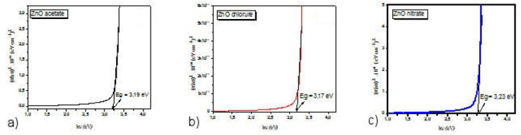Figure 5 Variation of (αhv)2 as a function of the energy of ZnO thin films. a) zinc acetate; b) zinc chloride; c) zinc nitrate.