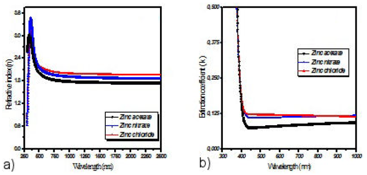 The refractive index n, extinction coefficient k and the thickness d of the thin films were estimated with the spPS (seed preprocessing Pattern search) technique[34]. The obtained values of the deposited films thicknesses are 282, 299, 291 (nm) for ZnO obtained from acetates, chloride and nitrates respectively The refractive index n (Fig. 6a) and the value of extinction coefficient k (Fig. 6b) varied from 2.13 to 1.8, and from 0.12 to zinc acetate, zinc chloride and zinc nitrate, respectively in the visible wavelength range. Similar values are observed in [15,22,33]. These films with low values of n and k are recommended for optoelectronic device applications such as solar cell window films [35,36].